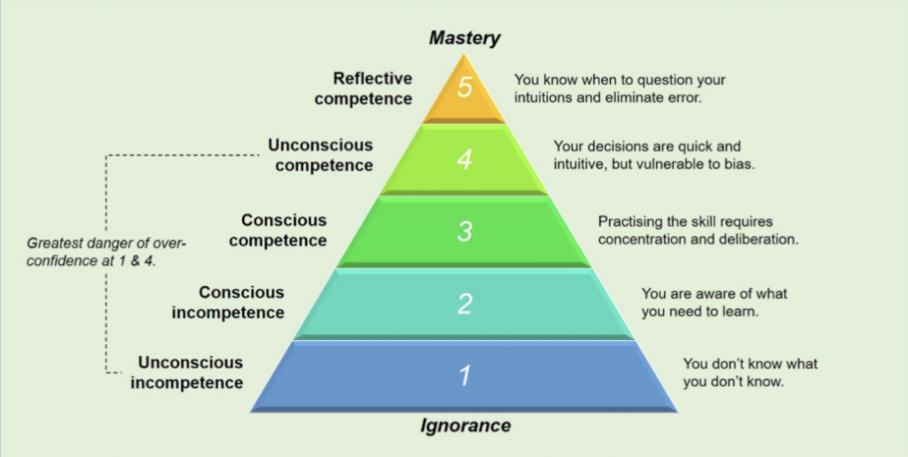This is an important concept to think about when learning or teaching anything new. I like to change the wording a little as I think if you don’t know something then you are unconscious of it but as you become aware of it and understand it through the layers it should be a partnership of conscious and Subconscious as you have trained yourself to create programs that can be switched on and initiated from a flinch or consciously triggered, an example of this is if you say “Kihon kata” you fire up a subconscious program that you follow. the quality of the program will obviously be a reflection of the amount of detail/understanding you put into the program.